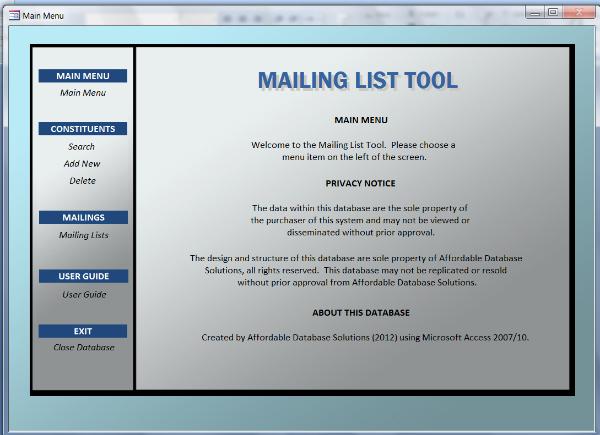 | Maintain up to four separate mailing lists with our Mailing List Tool. Easily add and remove members from each list, generate mailing labels, and quickly export address for mail merges. |